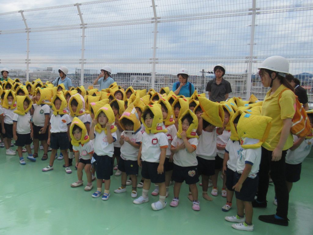 - 情報収集後、園舎2階では危険と判断した場合は、当園地震・津波避難棟の3階以上に避難を開始します。(避難棟へは1階、2階両方から避難することができます。)