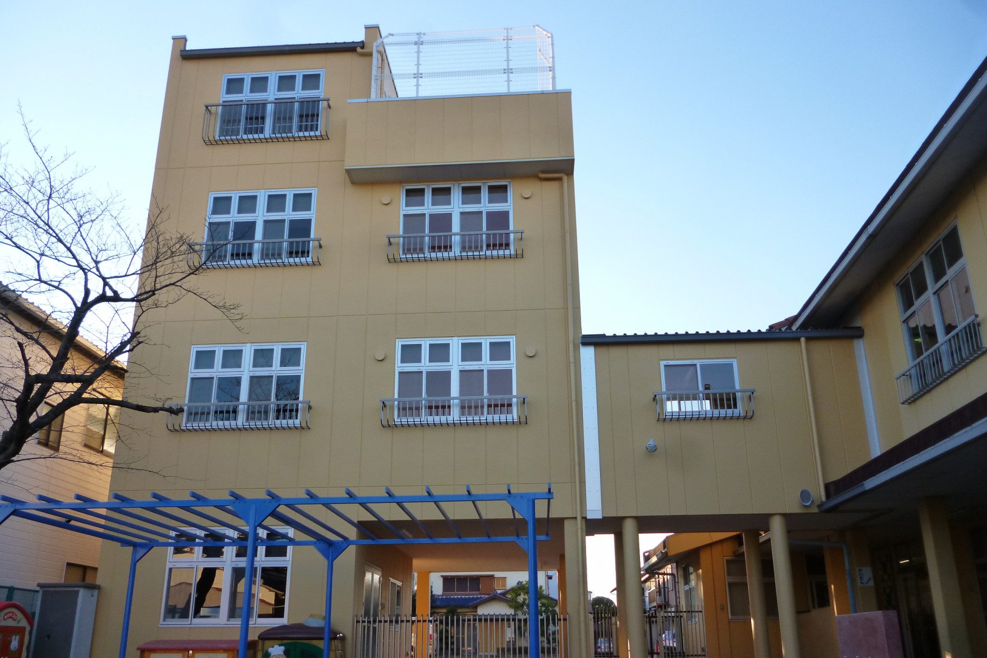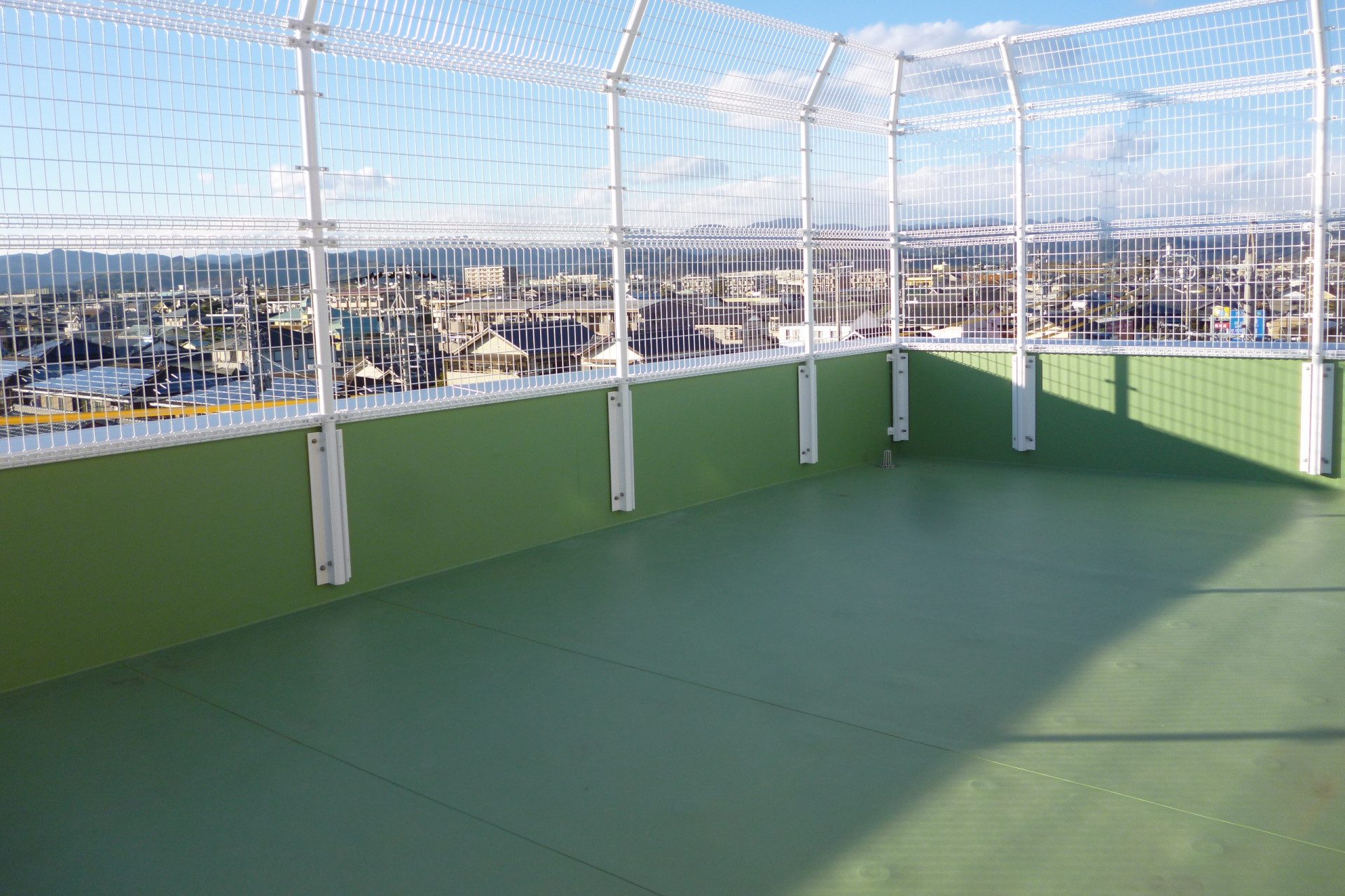 当園の「地震・津波避難棟」の特徴は、迅速に津波から避難できるように1階バスガレージ側の避難経路からも2階既設園舎側と繋がっている避難経路からも第1避難場所である3階屋上(海抜17M)へ避難することができます。