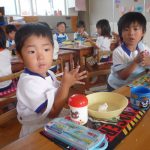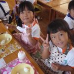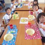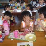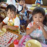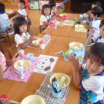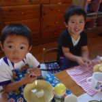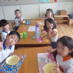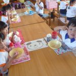 お月見団子を作ろう‼ 2014年10月03日 年少 年少 9月30日(火)に年少の子どもたちはお月見団子を作りました。 自分のエプロンを着て”Let’s cooking” 先生が白玉粉と上新粉を混ぜ、子どもたちは「がんばれ」「おいしくなれ」と応援してくれました 混ぜ終わると子どもたちは一口サイズにお団子を丸め「上手にできた」と、とても嬉しそうでした その後は、茹でて貰ったお団子にたっぷり黄粉をかけておいしくいただきました 自分たちで作ったお団子は、格別においしかったようです