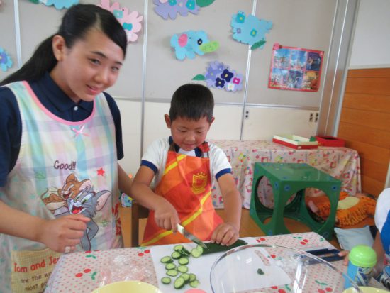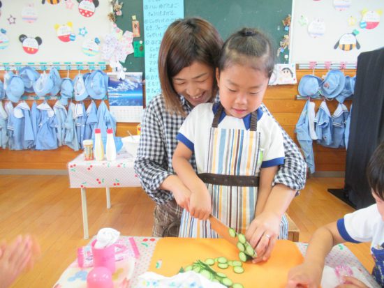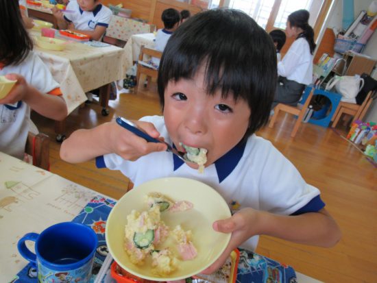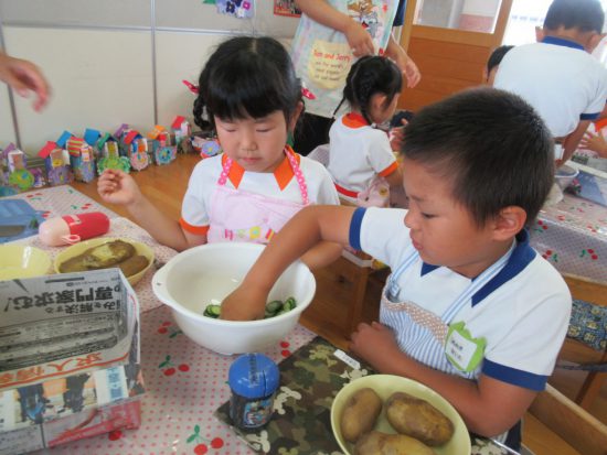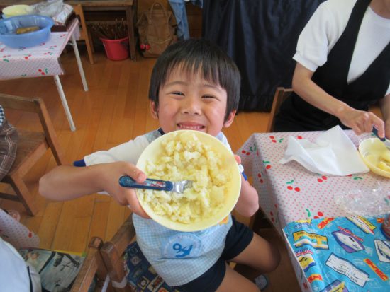 ポテトサラダを作ったよ♬ 2018年06月08日 年長 年長 6月1日(金)から少数保育参観が始まりました 年長児は田植えをしたり、体育レッスンをしたりと毎日元気いっぱいに過ごしています 6月6日(水)はクッキングをしました じゃがいも掘りでとったじゃがいもを使ってポテトサラダ作りに挑戦 お母さん先生にお手伝いをしてもらいながら包丁で切る作業にチャレンジ 各家庭の味が出て、子どもたちたちも「美味しい~っ」とおかわりをたくさんしていました 保護者の皆様、たくさんのお手伝いありがとうございました