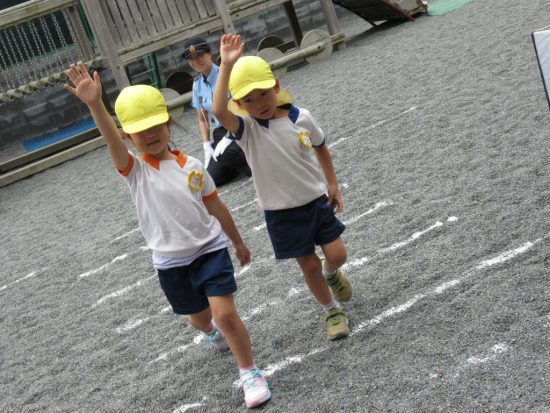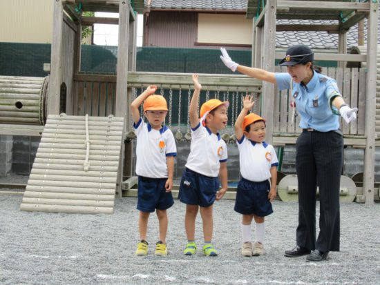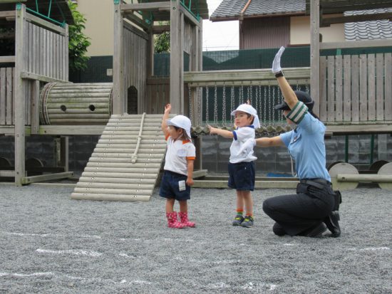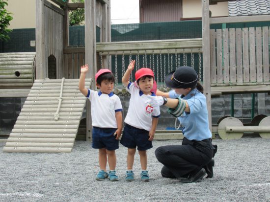 交通指のルールを教えていただき、実際に園庭に出て体験しました![]()