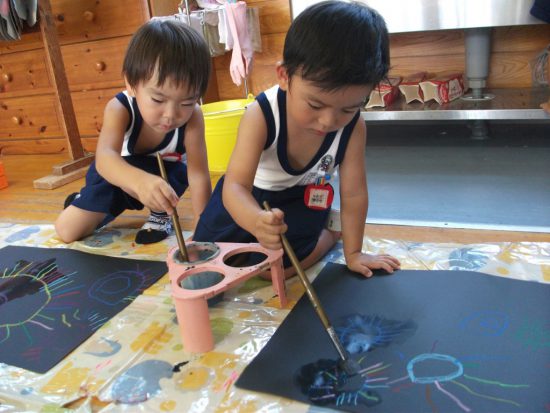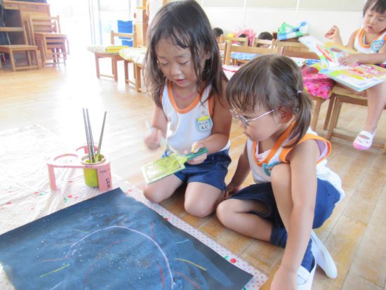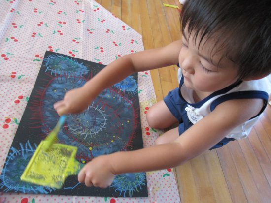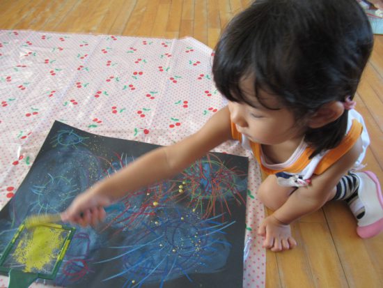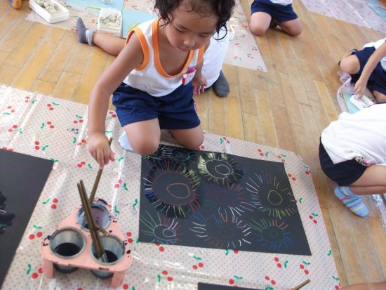 夏季保育中は花火の絵を描いたり、水あそびもたくさんしました