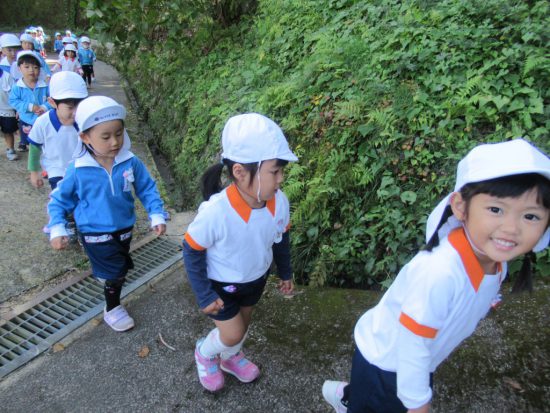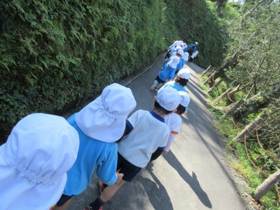 狭い道に怖がっている子、みんなで歩くことが楽しくて、