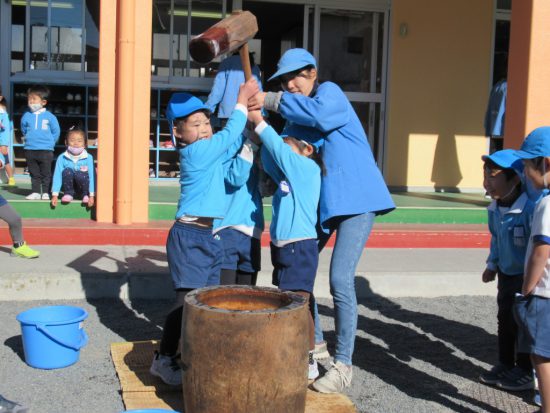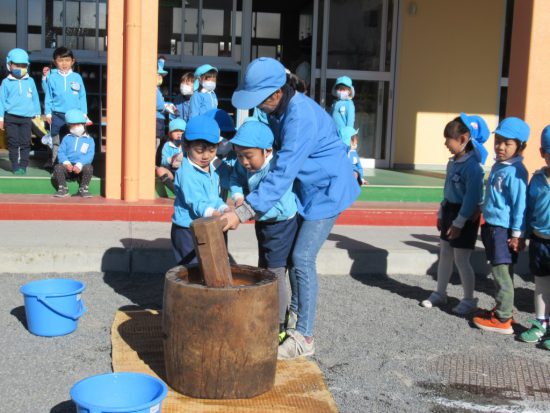 12月16日(水)、園庭で円を作り、年少・年中児はもちつきの様子を見学し、