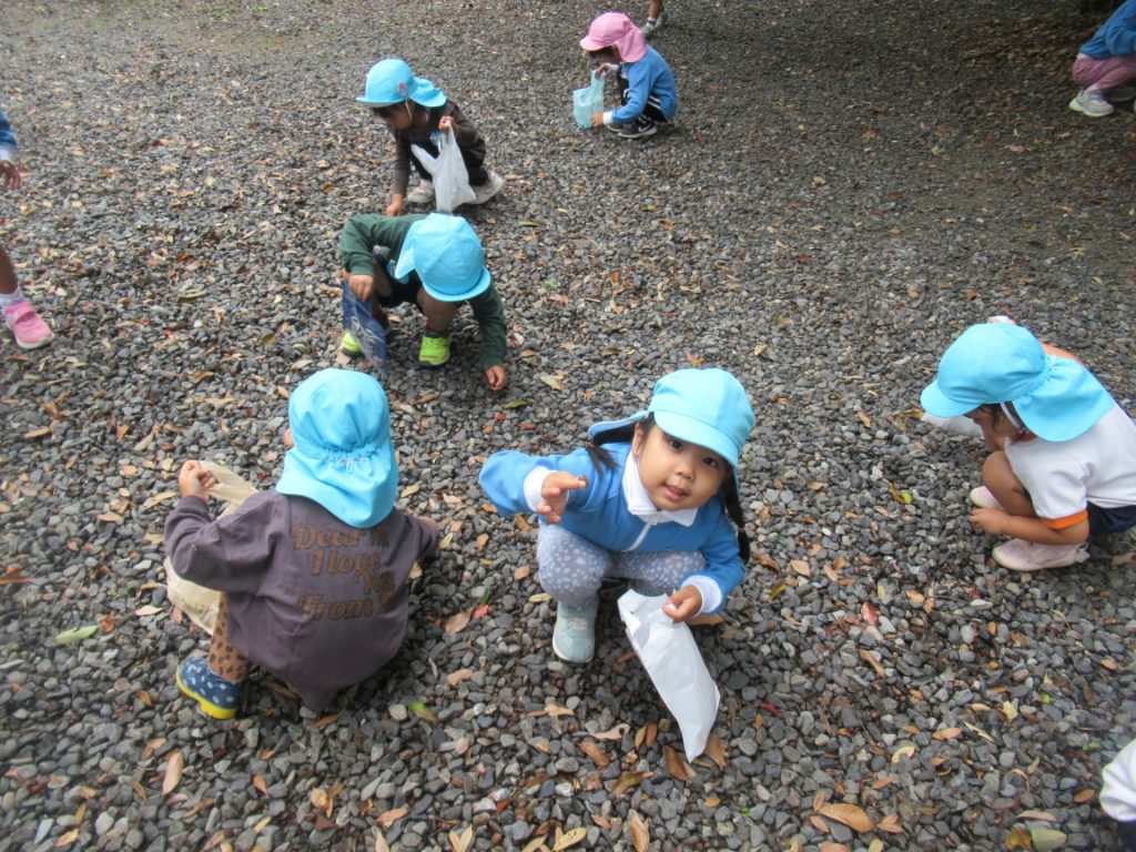 どんぐり拾いに行ったよ! 2024年10月22日 年少 10月18日(金)に年少さんで金毘羅山へおでかけ予定だったのですが、雨が心配だったので予定を変更し、加茂神社へどんぐり拾いに行ってきました🚎☀️ リュックサックを背負っての初めての園外保育にドキドキワクワクの子どもたち😆💕 神社に着くと、どんぐりがたくさん落ちていて更にワクワクUP😍💓 袋いっぱいにどんぐり、松ぼっくりや綺麗な葉っぱなどを集めていました😁🍂 園に着いてからみんなでシートを敷いて外でお昼ご飯を食べました😀🍙 あともう少し、秋を楽しみたいと思います😊🍂