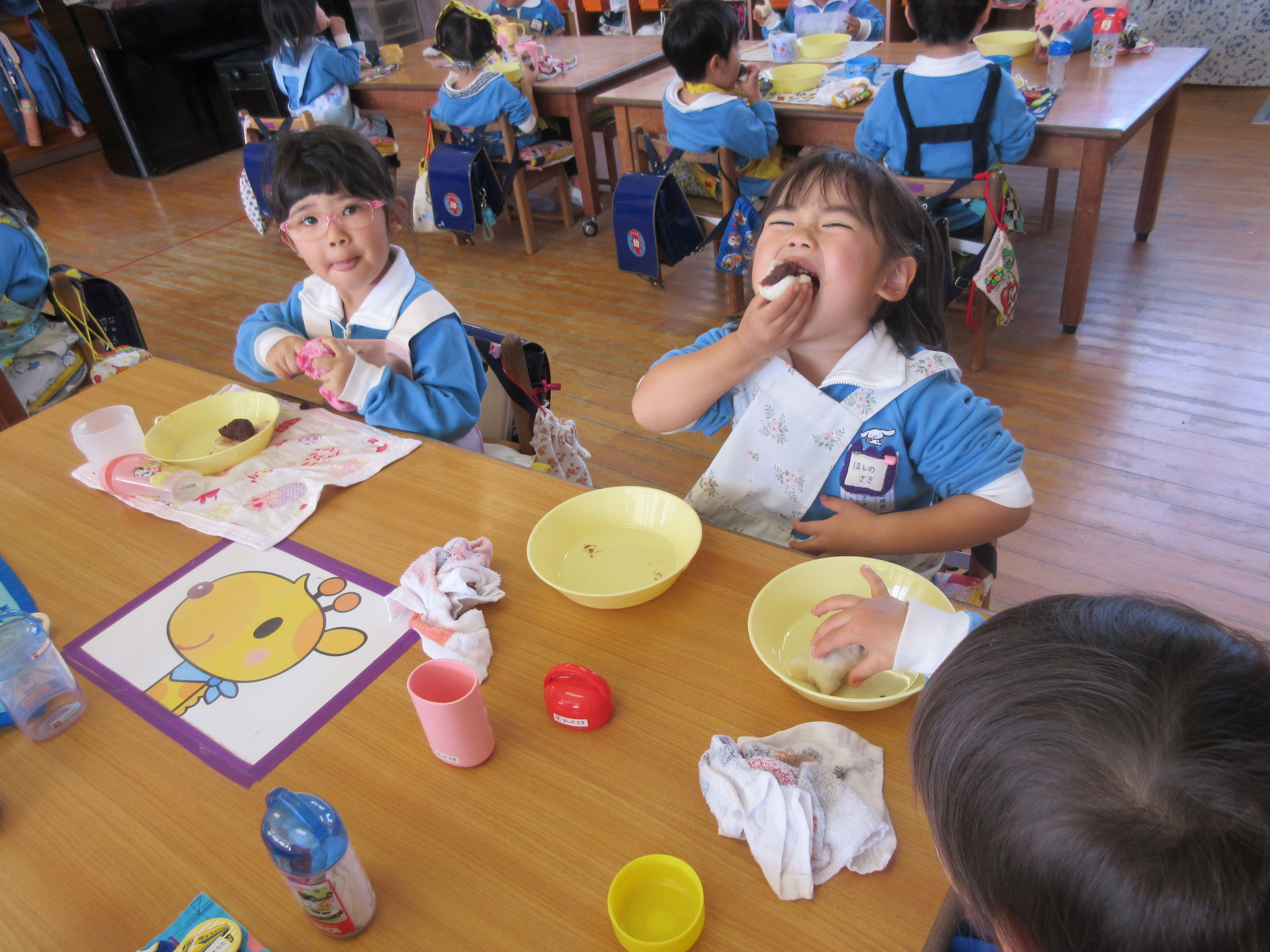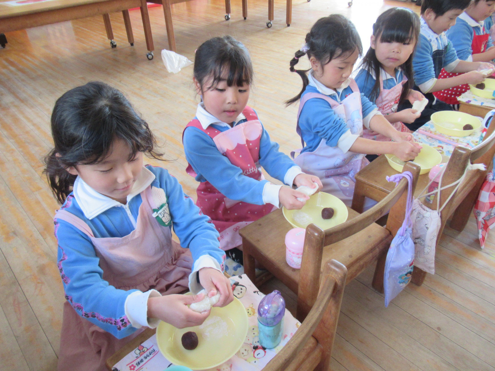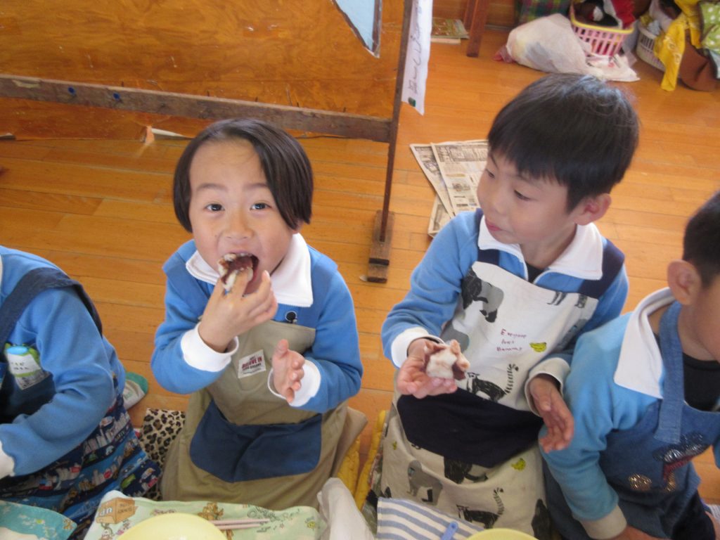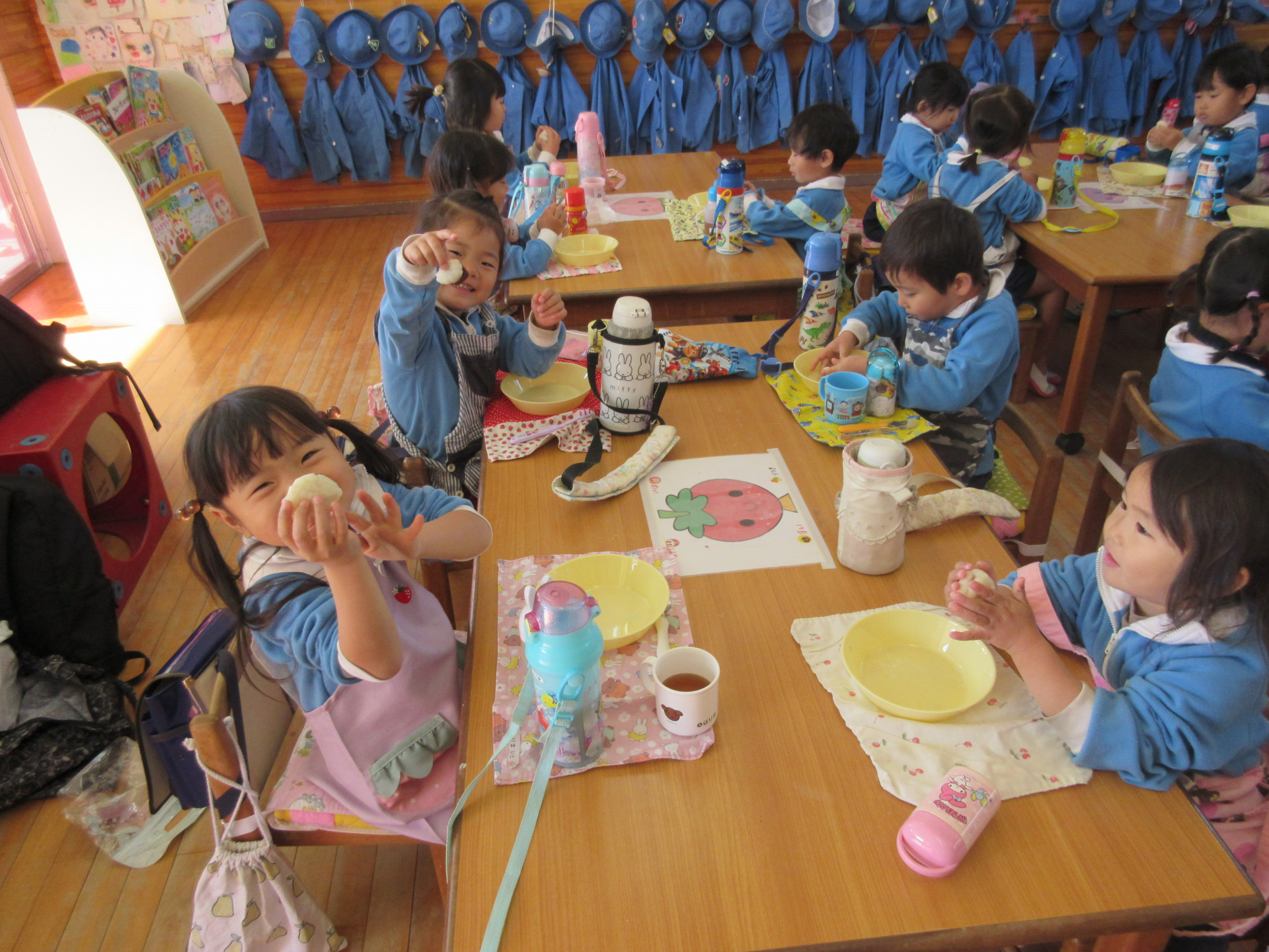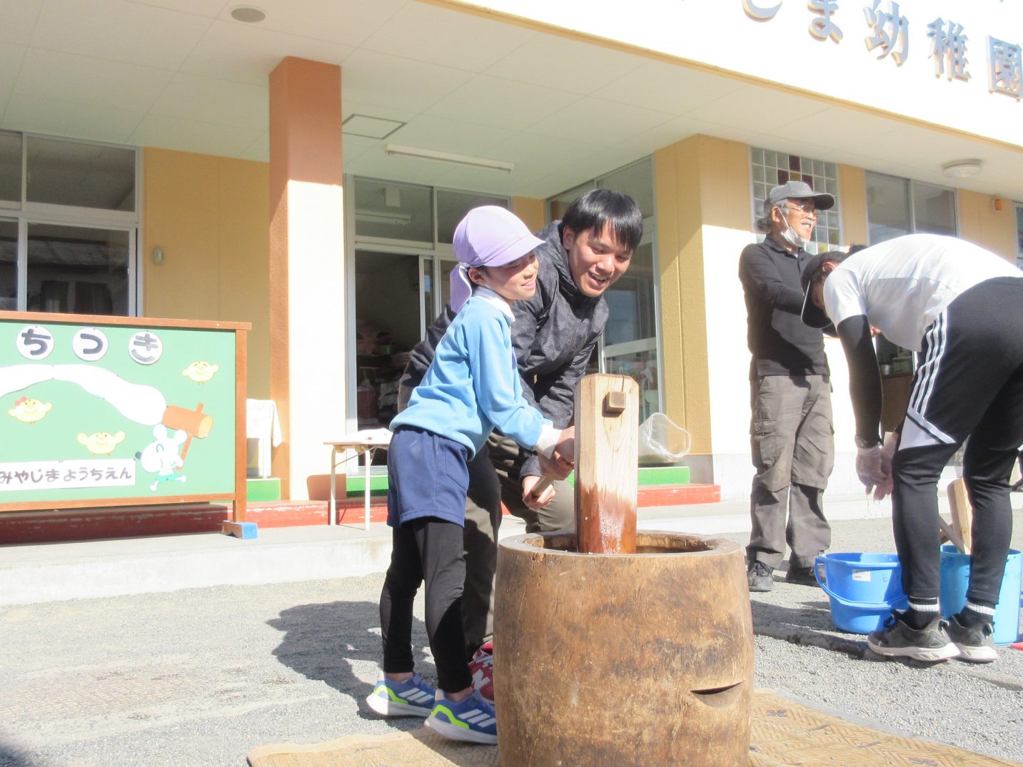 おもちつきをしたよ☺ 2024年12月12日2024年12月16日 共通 12月12日(木)にみんなでおもちつきをしました😀☀️ お集まりでおもちつきで使う道具を見たり、みんなで手遊びをしました😆🎶 その後は学年毎におもちつきの様子を見たり、年長さんはおもちつきの体験もしました✌️✨ クラスに戻ってからはつきたてのおもちに自分たちであんこを入れて包んで食べました😋💕 「びよーんって伸びるね‼️」「おいしいね💓」と大喜びの子どもたちでした😄🍂 日本の伝統文化の体験ができてよかったね☺️🎌