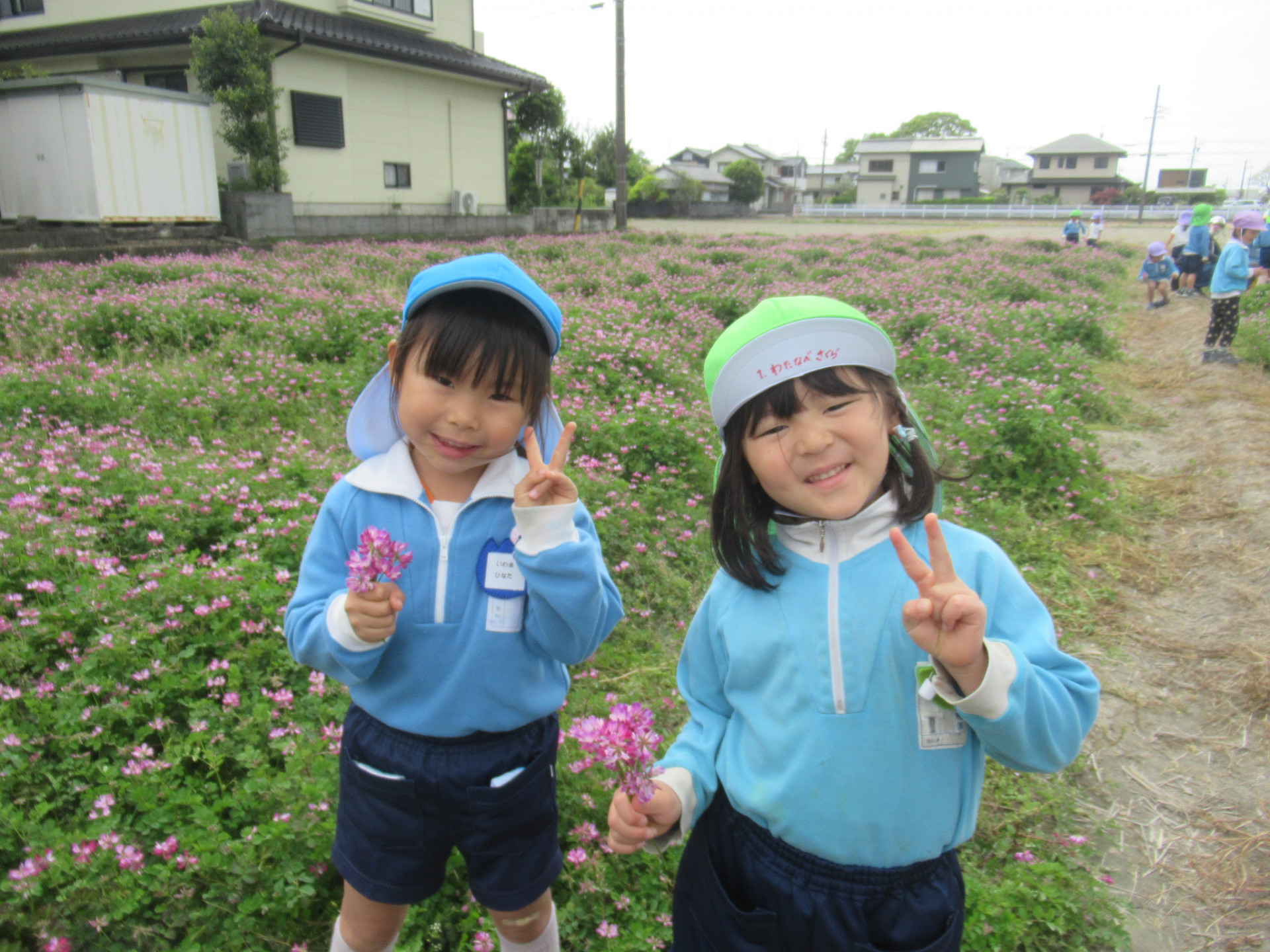 蓮華畑に行ったよ✨ 2025年04月24日 年中 年長 4月22日(火)に年中・長さんがバスに乗って初めてのお出掛け「蓮華畑」に行ってきました🚎🎶 行く途中にも蓮華畑があって、ピンクや紫色のじゅうたんに釘付けになっていた子どもたち😀✨ 実際に畑に着いて、お家の人へのプレゼントに蓮華を摘んで花束にして子どもたちもとっても嬉しそうでした💐🥰 中には虫探しに夢中になる子もいて、てんとう虫を捕まえていました🐞😍 春の初めてのお出掛け楽しかったね😊💕