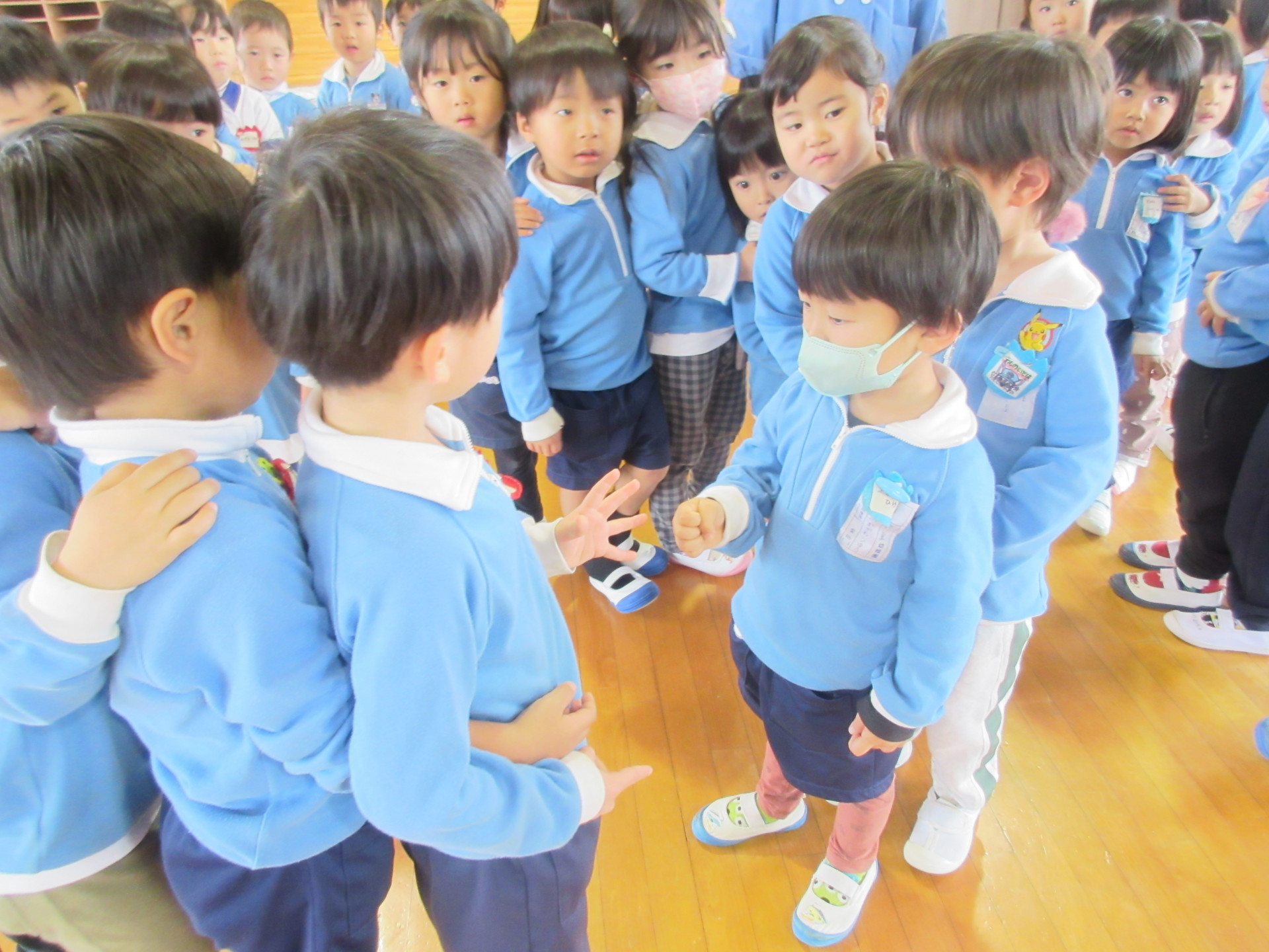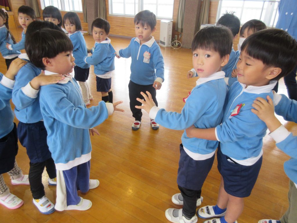大きな丸を作ってたき火の歌を歌ったり、3人組になっておもちつきの手遊び歌を歌いました😆🎶